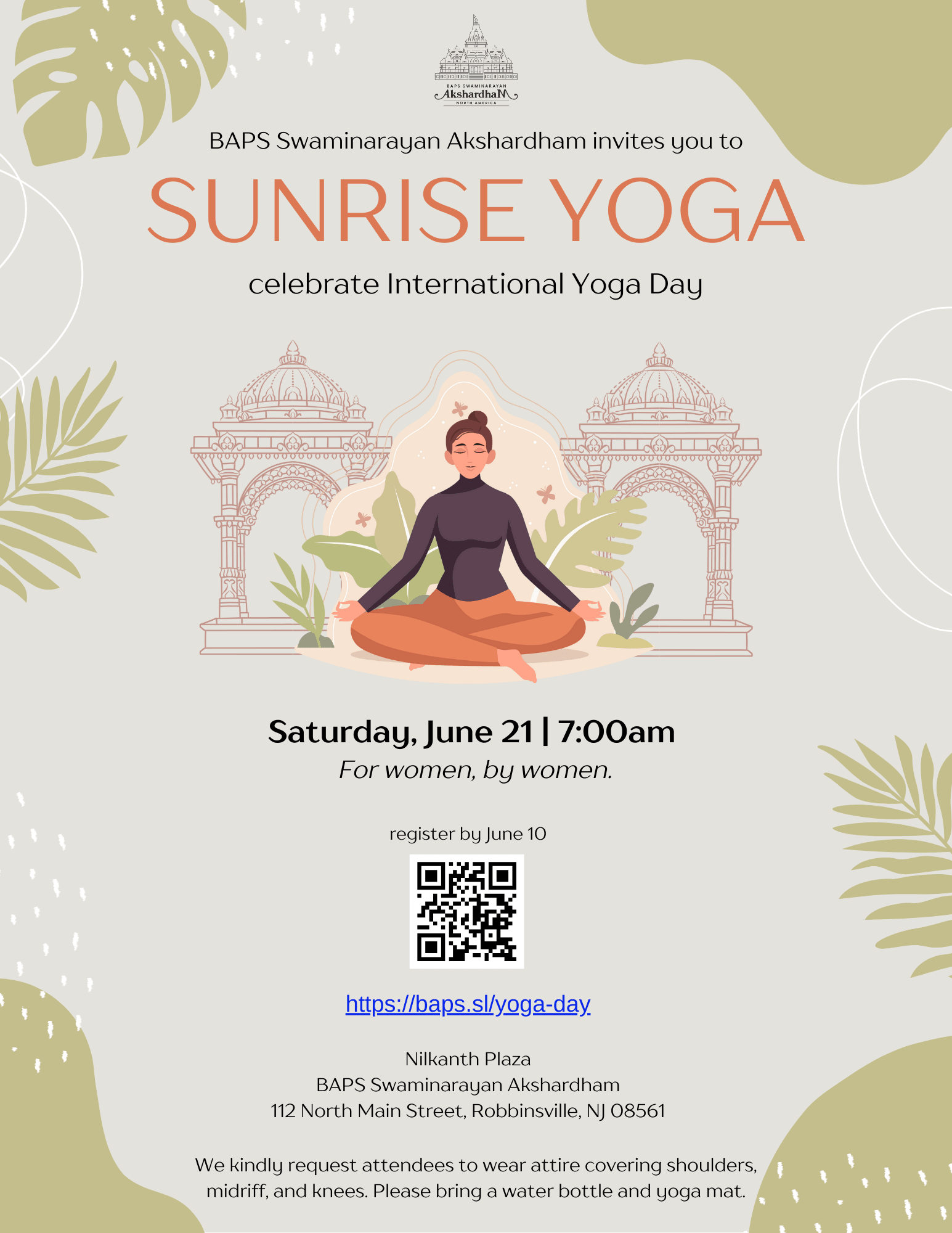 Saturday, June 21 | 7:00 AM | Nilkanth Plaza, BAPS Swaminarayan Akshardham Join us for a serene morning of mindfulness, movement, and connection at Sunrise Yoga — a special community event for women, by women, led by certified yoga instructor Deeksha Singh. Set against the inspiring backdrop of Tapomurti Shri Nilkanth Varni, this session honors both the International Day of Yoga and the enduring spirit of self-discipline, reflection, and inner strength. Nilkanth Varni’s yogic journey through the Himalayas reminds us that through stillness and self-discovery, we can cultivate peace within and share it with the world around us. 🌅 Arrival Time: 7:00 AM 🧘🏽♀️ What to Bring: Yoga mat, water bottle 💫 Location: Nilkanth Plaza, BAPS Swaminarayan Akshardham 💲 Fee: $10 per person Spots are limited and pre-registration is required! https://baps.sl/yoga-day