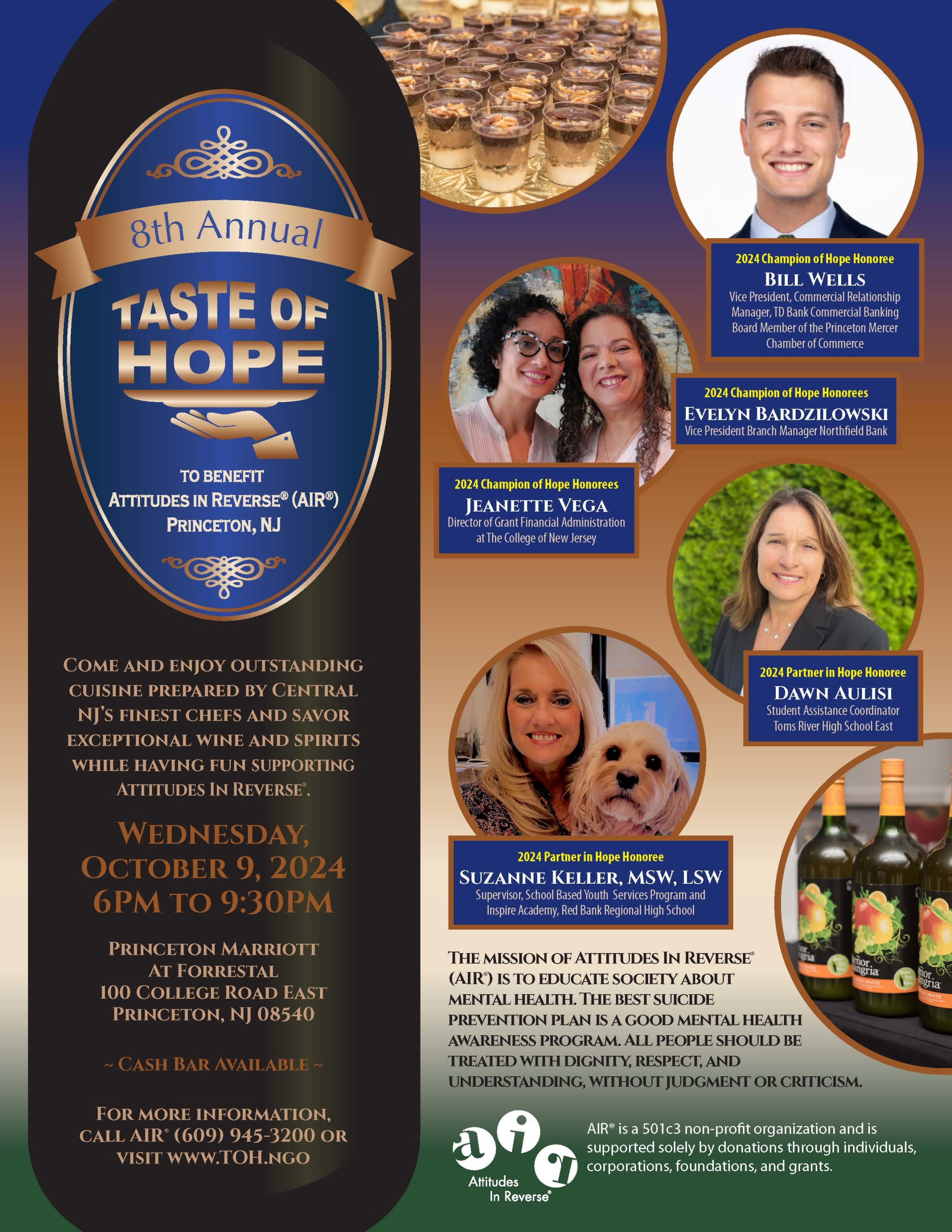 Attitudes in Reverse will be hosting their "Taste of Hope" event October 9th at the Princeton Marriott at Forrestal. They will be honoring several Chamber members and Princeton Chamber Board Member Bill Wells (TD Bank). Please consider attending and supporting and consider a sponsorship! Attitudes in Reverse works to support young adults and children with mental health and suicide prevention. Please call 609-945-3200 or visit www.TOH.NGO for more information or reach out to Dennis Dias at dennis62dias@gmail.com.