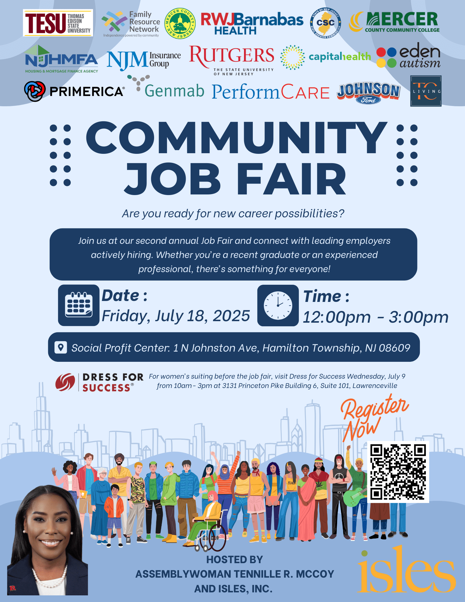 The second annual Community Job Fair hosted by the office of the Assemblywoman. Originally scheduled for July 1st, it will now be held on Friday, July 18, 2025, from 12:00 PM to 3:00 PM at the Social Profit Center at Mill One (1 N Johnston Ave, Hamilton Township, NJ 08609).
